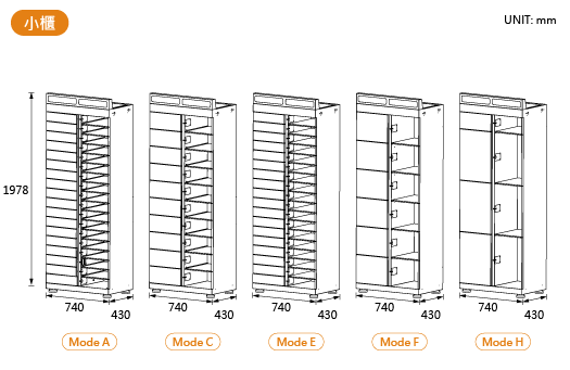 櫃型 | 尺寸 H x W x D(mm) | 櫃體層數 | 櫃格總數 | 層架抽換 |